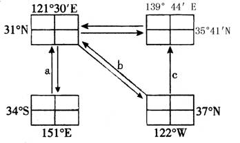 (上海市虹口区2010届高三上学期期终教学质量监控测试)全球80多个国家3000座城市于当地时间2009年3月28日20时30分起熄灯一小时。上海(31°N,121°E)、巴黎(48°N,2°E)、悉尼(32°S,151°E)、圣保罗(23.5°S,48°W)四城市加入了全球熄灯一小时活动。