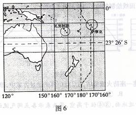 (北京市海淀区2010届高三上学期期中考试)2009年9月29日,萨摩亚地区(西11区)当地时间6时48分发生了里氏8.0级强烈地震,震中在15.5°S,172.2°W,震源深度约为33千米。10月9日,临近的岛国瓦努阿图(东11区)接连发生了3次7级以上强烈地震。读图6和资料回答6-9题。