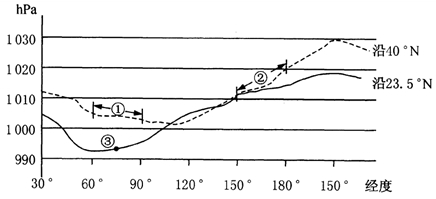 3.① ② ③ ④ 四地的气候主要由海陆热力性质差异造成的是 A.① B.② C.③ D.④ 4.② 地常年盛行风 A .由副热带高气压带吹向赤道低气压带 B .由副极地低气压带吹向副热带高气压带 C .由极地高气压带吹向副极地低气压带 D.由副热带高气压带吹向副极地低气压带 图3是某月份海平面平均气压沿两条纬线的变化图,读图回答 5-6 题。