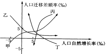 图 8 表示 1978-2008 年期间,甲、乙、丙、丁四城市人口变动统计情况图(人口迁移差额率为人口迁入与迁出的差额占总人口的比重)。读图回答11-12 题。