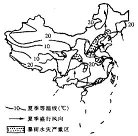右图为我国某年夏季等温线和盛行风向图,读图回答31-32题。
