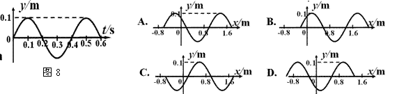 10、一列简谐横波沿x轴负方向传播,波速v=4 m/s,已知坐标原点 ( x=0 ) 处质点的振动图象如图8所示,在下列4幅图中能够正确表示t=0.35s时波形的图是 ( )