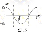 一个面积为S的矩形线圈在匀强磁场中以某一条边为转轴做匀速转动,磁场方向与转轴垂直。线圈中感应电动势e与时间t的关系如图15所示。感应电动势的峰值和周期可由图中读出。则磁感应强度B=_ ___;在t=T/12时刻,线圈平面与磁感应强度的夹角等于