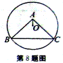 8. 如图,⊙O过点B 、C。圆心O在等腰直角△ABC的内部,∠BAC=900,OA=1,BC=6,则⊙O的半径为………………( C )