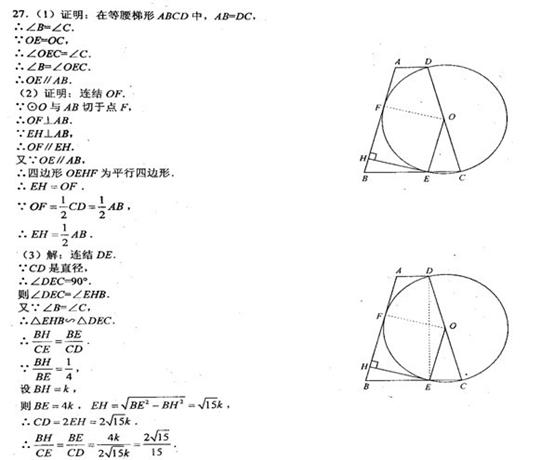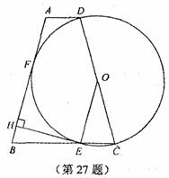(苏州2010中考题27).(本题满分9分)如图,在等腰梯形ABCD中,AD∥BC.O是CD边的中点,以O为圆心,OC长为半径作圆,交BC边于点E.过E作EH⊥AB,垂足为H.已知⊙O与AB边相切,切点为F