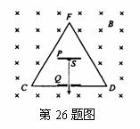 (20分)如图所示,在空心三棱柱CDF以外足够大的空间中,充满着磁感应强度为B的匀强磁场。三棱柱的轴线与磁场平行,截面边长为L,三棱柱用绝缘薄板材料制成,其内部有平行于CD侧面的金属板P、Q,两金属板间的距离为d,P板带正电,Q板带负电,Q板中心有一小孔,P板上与小孔正对的位置有一个粒子源S,从S处可以发出初速度为0、带电量为+q、质量为m的粒子,这些粒子与三棱柱侧面碰撞时无能量损失。试求: