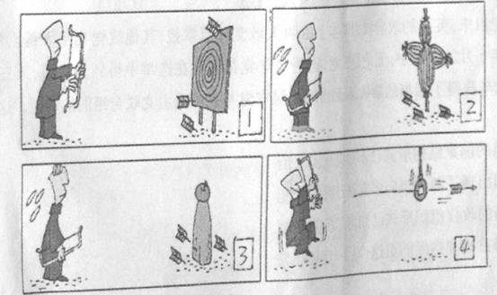 解析:回答漫画题最重要是的读懂漫画说明的意思。从所给4幅漫画中可以看出,射箭者不是勇敢的面对自己射不中靶子的现实,而是不断地去寻找射箭靶子,故D项符合题意要求。