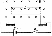 ”型导体框,左右两端分别插入两浅水银槽中,而两浅永银槽又与一电源和电键通过导线相连,导体框处于垂直纸面向里的磁感强度大小为B的匀强磁场中,当闭合电键K时,导体框立即跳起,测得跳起的最大高度为