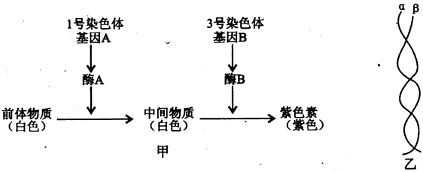 (1)甲图中基因通过控制 来控制生物性状。基因型为AaBb和aaBb的个体,其表现型分别是 和 。若以上两个个体杂交,子代中紫花植株和白花植株的比例为 。
