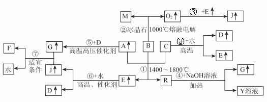 2.(15分)下图涉及多种无机化工反应,所涉及物质都是由短周期元素组成,其中R是一种新型无机材料,M是一种应用广泛的金属材料,F是人工合成的第一种有机物,且是一种常见的化肥材料,A、C、B、M均为常见元素的单质,“↑”表示该物质常温下是气体,反应G+J→F+H2O中G与J的最佳配比为2:1,向Y溶液中通入足量的J气体时可得到一种白色胶状沉淀,将该白色胶状沉淀滤出洗净后加热分解可以得到B。