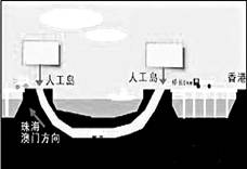 (福建省泉州市四校2010届高三上学期期末联考)2009年12月15日,港珠澳大桥正式动工,建成后,将成为世界最长的跨海大桥。港珠澳大桥会采用桥隧结合方式,大桥主体工程长29.6公里,桥贯通后,由香港开车到珠海或澳门,只需要15-20分钟,目前行船需1个小时。 读大桥设计图,回答12-13题。