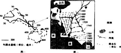 (山西省金谷中学2010届高三第一次练兵考试)图1是“我国某省年降水量分布图”,图2是“该省某地区甲河水系示意图”,读图回答18-20题。