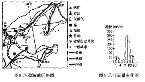 23.(云南省祥云二中2010届高三第二次周考(文综部分))环渤海经济圈是指以辽东半岛、山东半岛、京津冀为主的环渤海滨海经济带,同时延伸辐射到山西、辽宁、山东及内蒙古中东部。它是继长江三角洲和珠江三角洲之后迅速崛起的新的经济圈。读图8和读9,回答下列问题: