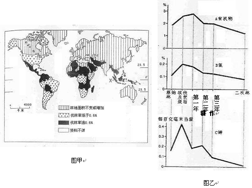 读以下两图,图甲显示2000年前后各国的每年伐林率,图乙为X地区某块农用土地的有机物、氮及钾的含量。分析回答问题。![]()