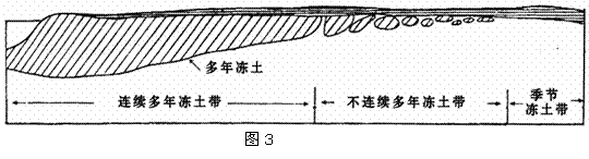 冻土是指温度在0℃以下,并含有冰的各种土体和岩石。冻土分为季节性冻土和多年冻土两类。季节性冻土指冬季冻结,夏季全部融化的土层;多年冻土指冻结持续三年或三年以上的冻土。图3是北半球南北方向多年冻土剖面图,读图回答7-9题。