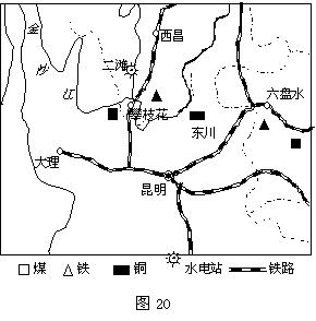 44.四川省攀枝花市位于横断山区,地处金沙江畔的峡谷中,钢铁工业是攀枝花市的主导工业部门。图20是“攀枝花市及其附近地区简图”,读图回答:(6分)