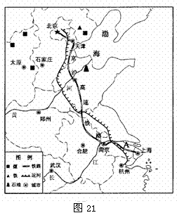 45.具有世界先进水平的高速铁路--京沪高速铁路,全长1318km,预计2010年年底全线贯通。图21为“我国部分区域示意图”。读图完成下列问题。(11分)