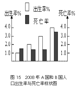 (2)试分别将A、B两国的人口出生率和死亡率转绘到图15中,并将该图中需完善的地方加以完善。(5分)
