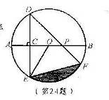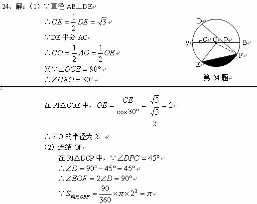24.(2010宁波市)如图,AB是⊙O的直径,弦DE垂直平分半径OA,C为垂足,弦DF与半径OB相交于点P,连结EF、EO,若DE=2,∠DPA=45°.