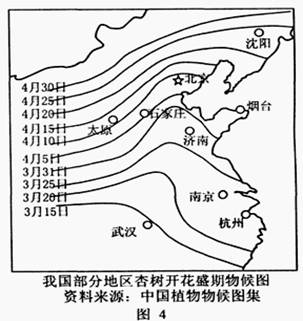 图4为我国部分地区杏树开花盛期物候图。读图回答3--4题。