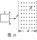 边长为L的正方形金属框在水平恒力F作用下运动,穿过方向如图10所示的有界匀强磁场区域。磁场区域的宽度为d(d>L)。已知ab边进入磁场时,线框的加速度恰好为零。则线框进入磁场的过程和从磁场另一侧穿出的过程相比较,有