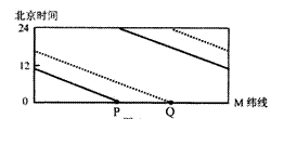图4中的实线和虚线分别示意某日晨线、昏线与M纬线相交点的时间变化情况。P、Q为M纬线上的两点,其经度差为9O0。读图4,完成l0~l1题。