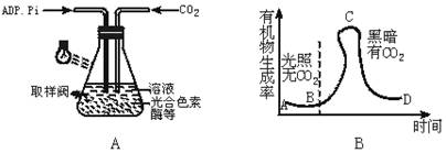 器的溶液中加进了ADP,磷酸盐,光合色素及有关的酶等(图A)。实验时,按图B的限制条件(光照、CO2等)进行,并不断测定有机物的生成率。随着时间的推移,绘出了曲线图(图B)。据此回答问题: