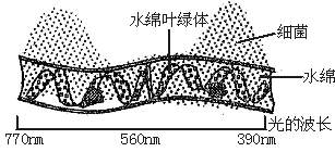 33.把载有新鲜水绵和细菌的临时装片,置于显微镜载物台上观察。光线从反光镜反射上来后,可看到细菌从分散状态逐渐向水绵方向运动,水绵附近细菌的密度增加。如果在反光镜上方放置一个三棱镜,使七种不同颜色的光束照射水绵的不同部位,这时看到细菌逐渐聚集成明显的两堆(如下图所示)。请回答: