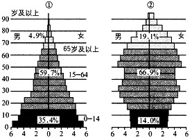 下图中的①②两图分别为两个国家的人口构成示意图,读图回答6-7题教育博客
