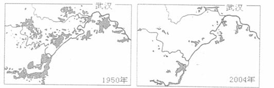 29.湿地有“地球之肾”之称,也是鸟类集中的栖息地,越来越被人们所关注。分析“长江中游湿地50年的变迁”图(阴影部分表示湿地)完成下列问题:(16分)