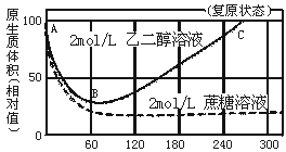 37.用2摩尔/升乙二醇溶液和2摩尔/升的蔗糖溶液分别浸浴某种植物细胞,观察质壁分离现象,得到其原生质体积变化情况如下图所示,请据图回答: