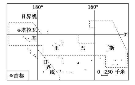 18.(2010年北京市丰台区期末练习)系列电影《加勒比海盗》中有一部叫《世界的尽头》。一支探险队经过长期调查后确认,位于太平洋的热带岛国基里巴斯(4°43′N-11°25′S,169°32′E-150°35′W)是地球上距大陆最远的地方,是名副其实的“世界的尽头”(如下图所示)。该国( )
