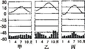 (2)右图是与B、E、H三地气候相对应的气温降水各月分配图