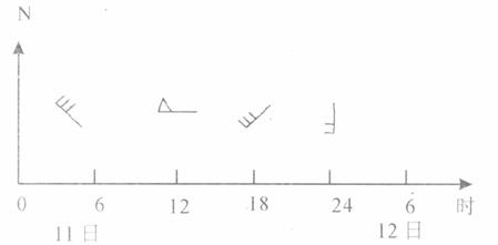 海南省“三防办”17日17时向媒体通报称:今年第2号台风“康森”自三亚登陆后,造成海南8个市县68个乡镇受灾,受灾人口572326人,死亡2人;受灾农作物面积11. 64万亩,直接经济损失2.4亿元。下图是我国沿海某城市在一次台风天气过程中的风向和风力变化图。风杆(长线段)上绘有风尾(短线段)的一方指示风向。每一道风尾表示风力2级,一个风旗表示风力8~12级。据此回答14~16题: