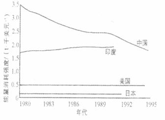 ②1980至1995年中国的能耗强度约下降了50%