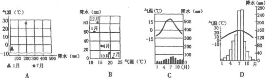 (1)下图的四幅气候统计图中,表示A地气候特点的是 。