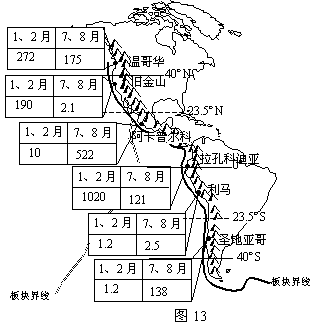 35.图13是“美洲大陆略图”。美洲大陆西部有世界上最长的科迪勒拉山系,它像一堵墙壁阻隔了东西水汽交换。图上表格中是西海岸部分地区1、2月和7、8月降水资料(单位:mm)。读图回答以下问题。(10分)