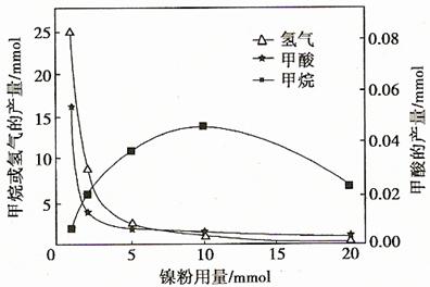 反应结束后,气体中检测到CH4和H2,滤液中检测到HCOOH,固体中检测到镍粉和Fe3O4。CH4、HCOOH、H2的产量和镍粉用量的关系如下图所示(仅改变镍粉用量,其他条件不变):