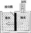 (2008·黑龙江)海水淡化可采用膜分离技术。如下图所示,对淡化膜右侧的海水加压,水分子可以透过淡化膜进入左侧淡水池,而海水中的各种离子不能通过淡化膜,从而得到淡水。对加压后右侧海水成分变化进行分析,正确的是( )。