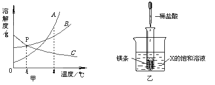 (3)如乙图所示,20℃时,把试管放入盛有X的饱和溶液的烧杯中,在试管中加入几小段镁条,再加入5mL稀盐酸,立即产生大量的气泡,同时烧杯中出现浑浊,则X可能为A、B、C三种固体物质中的哪一种? 。