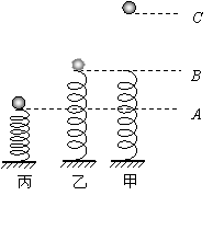 如图所示,质量为0.1kg的小球从竖立的轻质弹簧正上端 C(状态甲)由静止自由下落到弹簧上端B(状态乙),B为弹簧处于自然状态的位置,A为弹簧压缩到的最低位置(状态丙)。已知A、B的高度差为0.3m,B、C的高度差为0.5m,g=10m/s2。则下列说法正确的是:( )