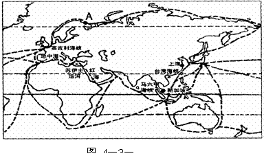 例:(2002,上海,10分)冬季,一艘货船从俄罗斯北部唯一的不冻港启航,沿欧亚澳航线经地中海、苏伊士运河、红海至印度洋,再向东穿过马六甲海峡经新加坡到上海。读图,回答:
