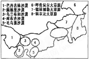 读我国某区域沙漠沙地和草原分布示意图,回答15-17题。