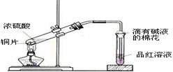 [解析]当铜片接触热浓硫酸时,有大量的白雾产生(白雾是由于二氧化硫气体与水结合形成亚硫酸小液滴缘故)并沿支管口喷在品红试纸上,使品红试纸的红色开始褪色,而且原来无色硫酸溶液开始变绿,当品红试纸完全褪成白色后,把铜片向上提使其离开浓硫酸溶液,反应马上停止。