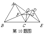 10.如图所示,已知△ABC和△DCE均是等边三角形,点B、C、E在同一条直线上,AE与BD交于点O,AE与CD交于点G,AC与BD交于点F,连接OC、FG,则下列结论要:①AE=BD;②AG=BF;③FG∥BE;④∠BOC=∠EOC,其中正确结论的个数( )![]()