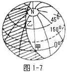 30.读图1-8,甲为太阳能热水器安装示意图,为提高太阳能利用率,在不同季节可适当调整调节杆。乙图为某日地球光照示意图。此日,若甲地(40°N、80°E)某太阳能热水器此时为一日内最可充分利用太阳能的时刻,请据此回答:(10分)