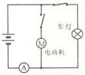 12.汽车电动机启动时车灯会瞬时变暗,如图,在打开车灯的情况下,电动机未启动时电流表读数为l0 A,电动机启动时电流表读数为58 A,若电源电动势为12.5 v,内阻为0.05Ω,电流表内阻不计,则因电动机启动,车灯的电功率降低了 ( )