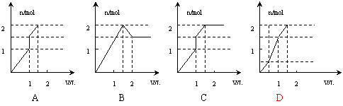 15. (河北舞阳一高09高三10考)向含1mol HCl和1mol MgSO4的混合溶液中加入1mol·L-1的Ba(OH)2溶液,产生沉淀的物质的量(n)与加入Ba(OH)2溶液体积(V)间的关系图正确的是 ( )