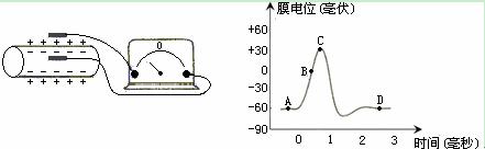 用电表测量神经纤维某部位在受到一次刺激前后膜内外的电位变化,正确的说法是 ( )
