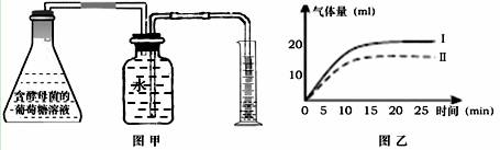3.在盛有300ml5%的葡萄糖溶液的锥形瓶中加入10g新鲜的酵母菌进行酒精发酵。将整个装置(如下图甲)置于25℃环境中,采用排水集气法测定产生的CO2,结果如下图乙中曲线Ⅰ所示。利用同样的实验装置,改变某条件后,结果如图乙中曲线Ⅱ所示。则改变的条件最可能是 ( )
